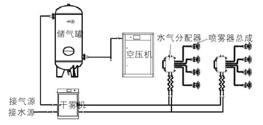 微霧抑塵裝置采用模塊化設(shè)計(jì)技術(shù)。由微霧機(jī)/干霧機(jī)、螺桿式空氣壓縮機(jī)、儲氣罐、噴霧器總成、微霧箱總成/水氣分配器、微霧箱總成控制器、水氣連接管線、電伴熱系統(tǒng)和自動控制系統(tǒng)等組成。