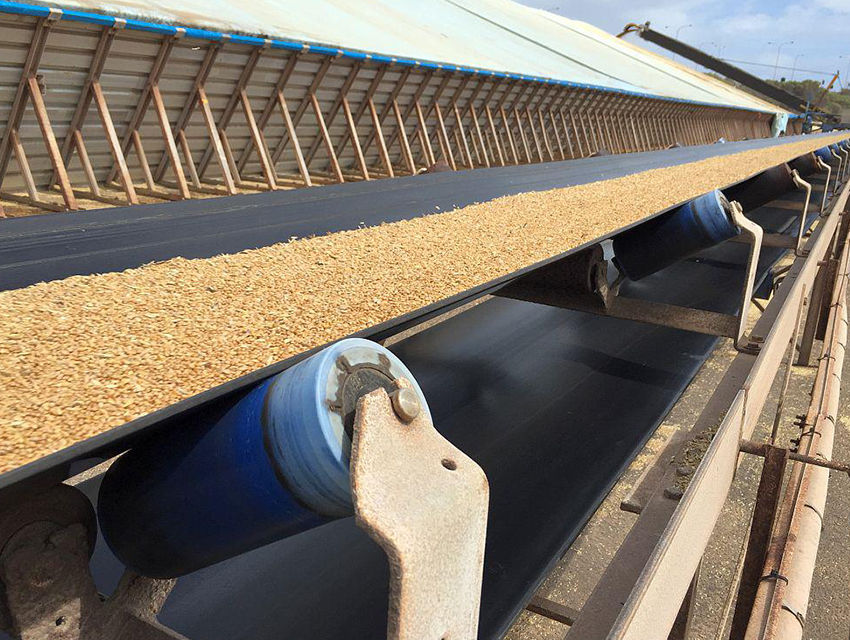 織物芯輸送帶是由多層浸膠尼龍(NN)帆布、聚酯(EP)帆布、EE型帆布為骨架材料,覆有具有不同性能的覆蓋膠,經(jīng)過壓延、成型、硫化等工序制作完成??椢镄据斔蛶Ь哂袔w彈性好、強(qiáng)力高、抗沖擊、耐屈撓性好、成槽性好、伸長率低等優(yōu)勢。