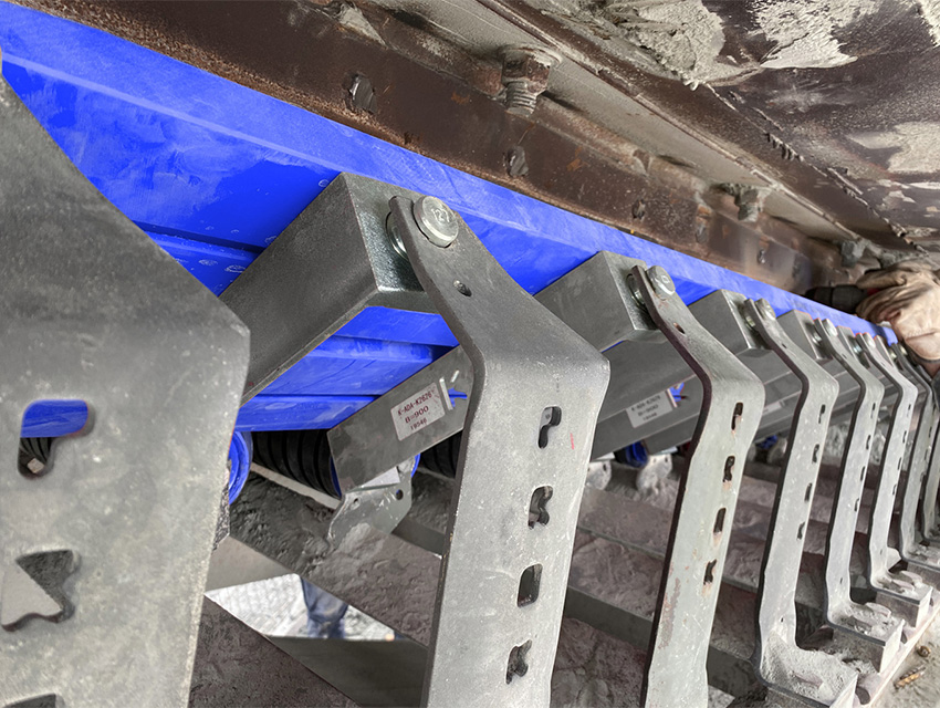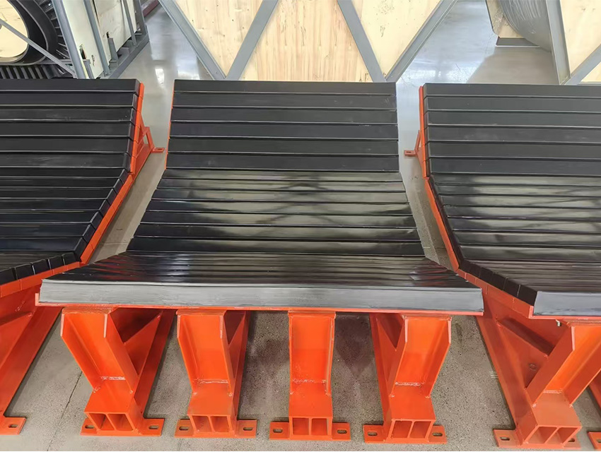緩沖床安裝在物料落料點(diǎn),可有效吸收物料下落產(chǎn)生的沖擊力,防止損傷輸送帶及輸送帶機(jī)架,同時(shí)兩側(cè)緩沖條和輸送帶托輥可以調(diào)節(jié)至一致角度,防止物料從輸送帶邊緣灑落。