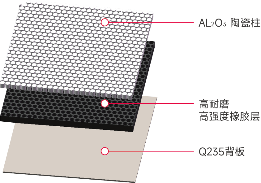 防脫落:陶瓷橡膠鋼板一體硫化,熱硫化工藝使其結(jié)合更牢固,每塊陶瓷都有穿透式螺栓穿過底部鋼板,焊接牢固,雙重保險;
